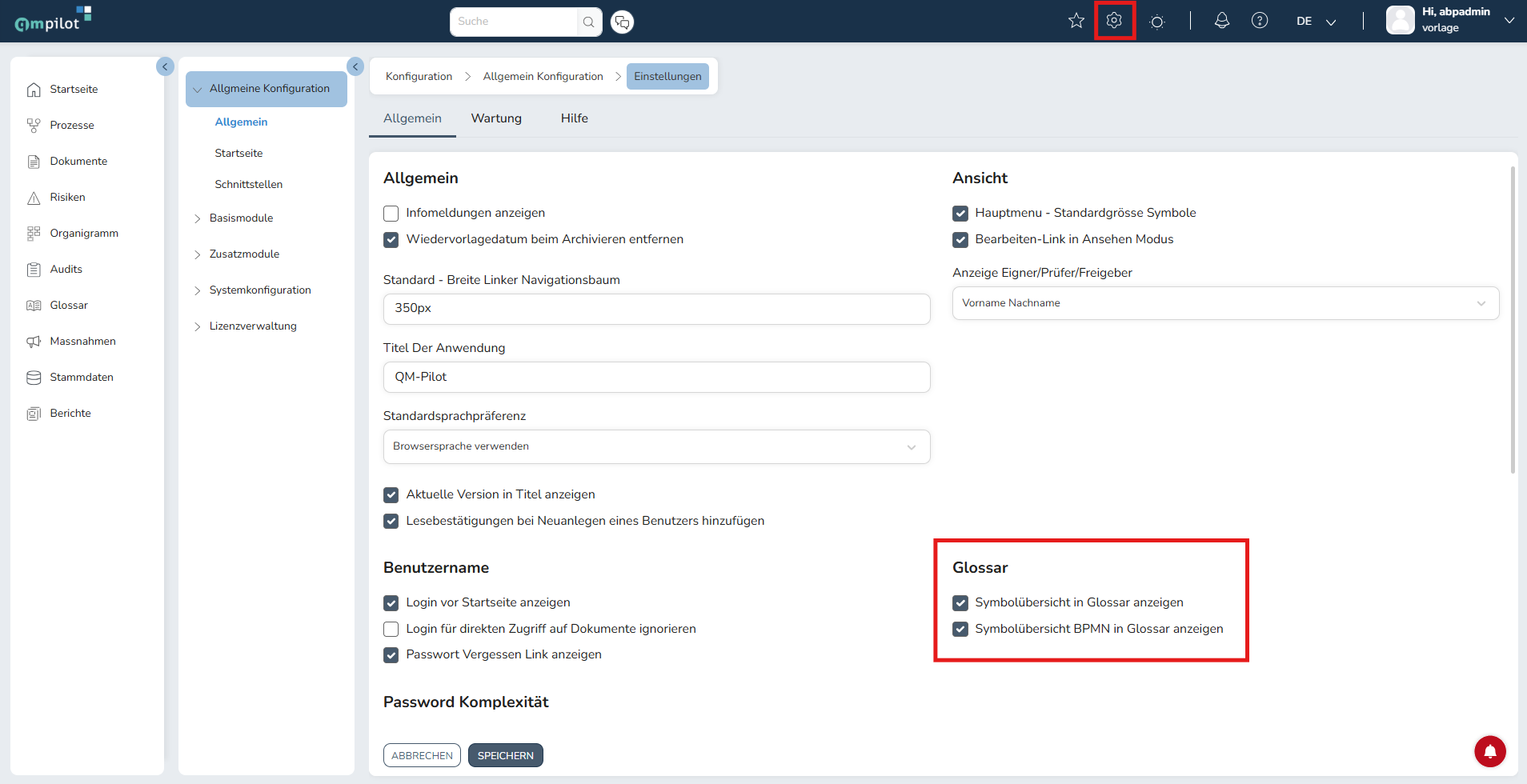 Die Symbolübersicht für die ISO bzw. BPM-Notation kann nicht bearbeitet, sondern nur angezeigt oder deaktiviert werden im Glossar. Dazu im Konfigurationsbereich (Zahnrad) -> Allgemein Konfiguration