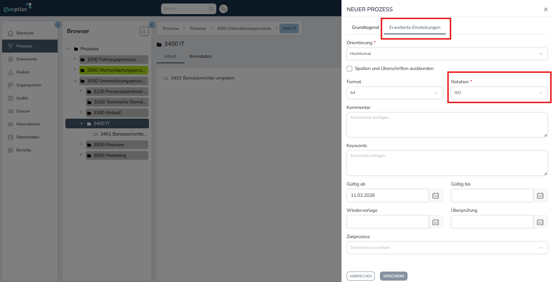 Im Prozessmanagement kann zwischen der ISO und der PMN Notation gewählt werden. Die Notation wird beim Anlegen eines Prozesses unter den erweiterten Einstellungen ausgewählt: