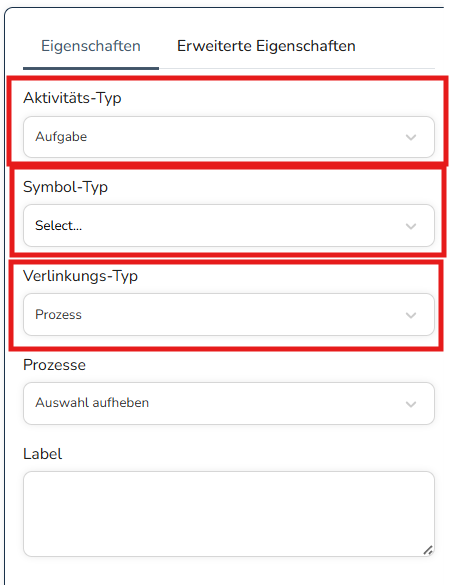 In den Symboleigenschaften kann der Aktivitätstyp geändert sowie der Symbol-Typ und der Verlinkungs-Typ ausgewählt werden, wenn z.B. ein Prozess, Dokument oder Risiko auf dem Symbol verknüpft werden soll:
