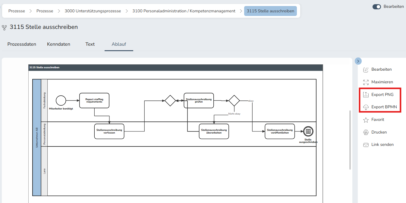 Die BPMN-Prozessdiagramme können als PNG oder als BPMN-XML exportiert werden. Die BPMN-XML Dateien können von manchen anderen System gelesen werden.