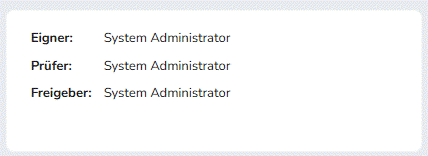 Une seule personne responsable peut être inscrite comme propriétaire de chaque contenu. Selon la définition, cela est responsable du contenu du processus, des documents ou du risque. Dans certains cas, l'administration du contenu est déléguée, de sorte que non pas la personne principalement responsable du contenu est désignée comme propriétaire, mais la personne responsable de l'administration. Dans ce cas, la personne responsable du contenu peut également être inscrite comme examinateur ou apposite. | Un ou plusieurs critiques peuvent être inscrits pour chaque contenu. Les examinateurs prennent généralement en charge l'examen substantiel et formel. Si le contenu doit être examiné sous plusieurs angles, plusieurs évaluateurs peuvent être déployés. Selon la configuration d'autorisation, tous les évaluateurs doivent définir le contenu sur audité ou un seul évaluateur avec l'autorisation appropriée. | Un ou plusieurs approbateurs peuvent être inscrits pour chaque contenu. Les approbateurs donnent l'approbation finale pour la publication du contenu dans la section Réputation. Dans un principe des quatre yeux, ou propriétaire et libérateur, c'est la même personne. Cependant, une personne principalement responsable du système peut également être désignée comme apponteur afin de vérifier la conformité à toutes les spécifications. |
